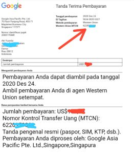 1. mendapatkan tanda terima pembayara/pengiriman seperti gambar dibawah ini. didalamnya ada nama dan alamat pengirim, nama dan alamat sesuai ktp penerima, nominal pengiriman, tanggal kapan bisa diambil uangnya, kode western union MTCN (kode unik ini untuk penarikan uang) dll.