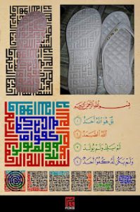 dahulu sempat heboh kaligrafi bentuk petak berisi ayat alquran yang dicetak pada telapak sendal, ini tersebar di group dakwah whatsapp. hal ini bermula tertangkapnya mobil mengangkut barang dagangan berupa sendal jepit yang akan dipasarkan. sebagian produk telah berada di tempat pemasarannya sehingga pihak yang berwenang segera tindak tanggap.